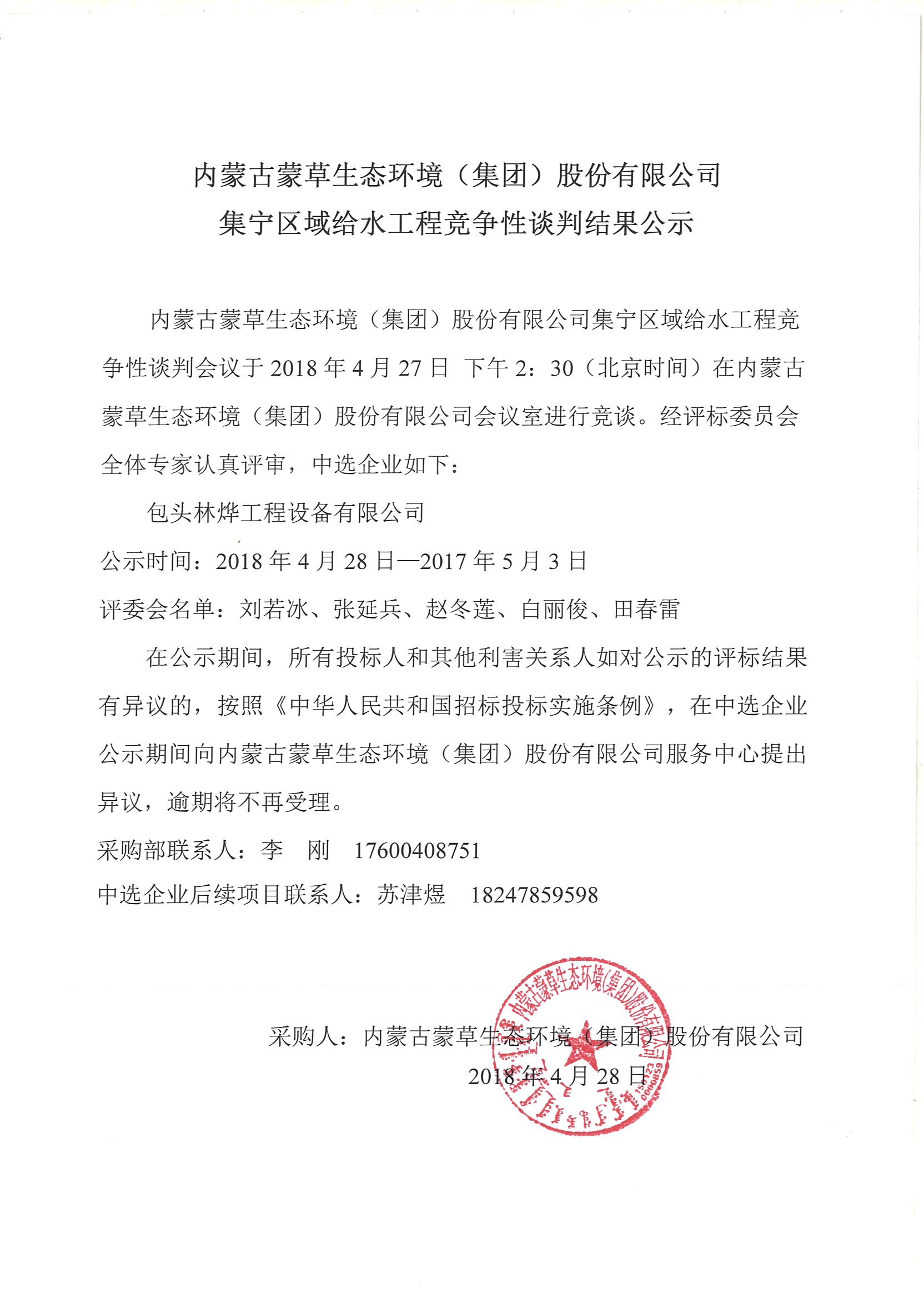 內(nèi)蒙古蒙草生態(tài)環(huán)境(集團(tuán))股份有限公司集寧區(qū)域給水工程競爭性談判會議于2018年4月27日 下午2:30(北京時(shí)間)在內(nèi)蒙古蒙草生態(tài)環(huán)境(集團(tuán))股份有限公司會議室進(jìn)行競談。經(jīng)評標(biāo)委員會全體專家認(rèn)真評審,中選企業(yè)如下: