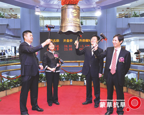 9月27日上午9時25分,公司董事長王召明敲響深圳證券交易所上市寶鐘,內(nèi)蒙古和信園蒙草抗旱綠化股份有限公司在深圳證券交易所首發(fā)A股股票并在創(chuàng)業(yè)板成功上市,股票簡稱“蒙草抗旱”,股票代碼“300355”。公司股票開盤表現(xiàn)強(qiáng)勁,大漲94.92%,創(chuàng)出了今年深交所新股上市首日最大漲幅。