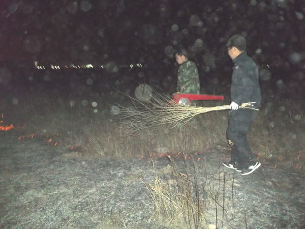 2014年3月26日晚23時,當(dāng)人們還沉浸在溫暖的小家即將進(jìn)入夢鄉(xiāng)的時候,位于呼市新城區(qū)保合少鎮(zhèn)甲蘭板村西側(cè),突然燃起熊熊大火,火勢借助風(fēng)勢迅速蔓延。此時,距離火場2公里外的蒙草抗旱大青山萬畝草原項目部人員還在梳理和安排工作,項目經(jīng)理張成學(xué)接到火情電話后,迅速布置安排。大家拿起項目部儲備的滅火工具,組成臨時救火隊奔向大火現(xiàn)場。