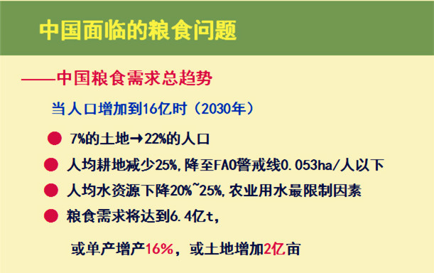 當中國人口增加到16億時,人均耕地將減少25%,會達到世界糧食組織的警戒線。人均水資源將下降20-25%。糧食需求,到時將達到6.4億噸。如何解決6.4億噸糧食呢?一是將現(xiàn)在的單產提升16%,二是增加2億公頃耕地。但是,這是一個非常難以做到的事情。最近幾年,糧食連續(xù)增產,生產能力達到極限。農業(yè)科技能力達到40%,肥料水平達到35-40%,灌溉面積達到41.5%。