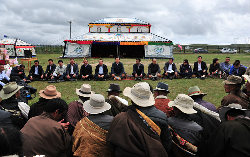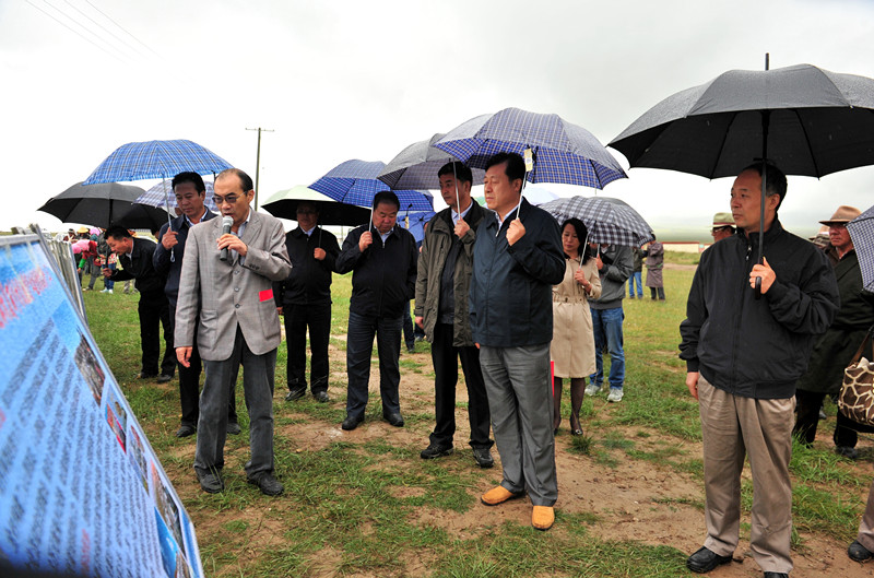 8月的青海草原,長勢良好,在霏霏細雨的潤澤下更顯郁郁蔥蔥。于康震及蒙草公司代表一行剛到活動現(xiàn)場,就冒雨觀看畜牧業(yè)生產(chǎn)和草原保護建設展板,向縣里和 村里的同志詢問近年來畜牧業(yè)發(fā)展、草原保護和牧民生產(chǎn)生活變化情況。我們保護草原環(huán)境、為草原修復生態(tài)、建立現(xiàn)代化的草原草產(chǎn)業(yè)平臺的終極目標,是還草原 上的牧民一片“更藍的天空、更綠的草地”,讓人與自然和諧發(fā)展。