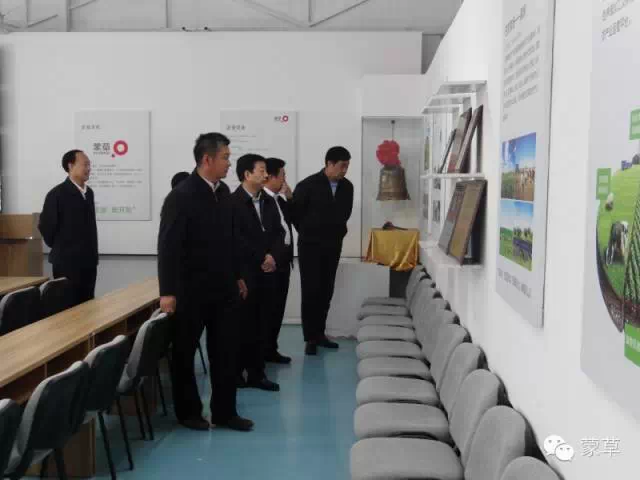 馮新柱一行在蒙草展廳觀看蒙草發(fā)展歷程圖片展