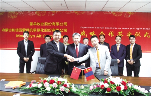 2015年3月30日,蒙草公司、蒙羊牧業(yè)與蒙古國(guó)蒙古之金公司(Mongolyn Alt Corporation)達(dá)成戰(zhàn)略合作并簽署備忘錄。