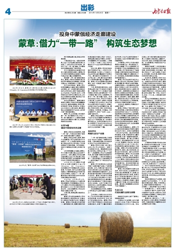 2015年10月26日,內(nèi)蒙古日?qǐng)?bào)全版刊登文章“投身中蒙俄經(jīng)濟(jì)走廊建設(shè)--蒙草:借力“一帶一路”構(gòu)建生態(tài)夢(mèng)想”