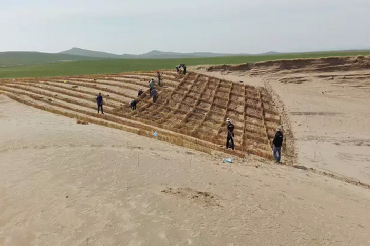 據(jù)研究人員介紹:烏拉蓋草原存在一條暗沙帶,近年來由于過度放牧,出現(xiàn)了多個(gè)大的風(fēng)蝕坑。在風(fēng)蝕坑中分為陡坡區(qū)、緩坡區(qū)、平坦區(qū),復(fù)雜的風(fēng)蝕地貌需要不同的修復(fù)方法。在沙地中心風(fēng)蝕坑采用埋置機(jī)械沙障+生物沙障+人工撒播+枯草鋪設(shè),在緩坡區(qū)采用人工撒播+葦簾鋪設(shè),在陡坡區(qū)采用人工撒播+葦簾鋪設(shè)+鐵絲網(wǎng)鋪設(shè),在平坦區(qū)采用圍欄封育。制定不同組合修復(fù)方式,避免外界因素的干擾,還原植物生長的環(huán)境。使天然植物物種得意休養(yǎng)生息,煥發(fā)植物自我修復(fù)的能力抑制草原繼續(xù)沙化。與此同時(shí),研發(fā)人員還采用一年生與多年生植物種子、豆科和禾本科植物種子進(jìn)行混播,讓一年生的植物快速生長,為多年生的植物提供適宜的生長環(huán)境,從而達(dá)到防沙、固沙的目的。