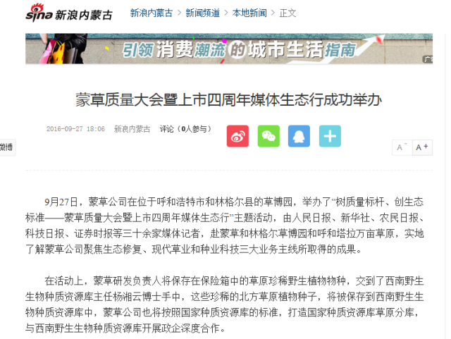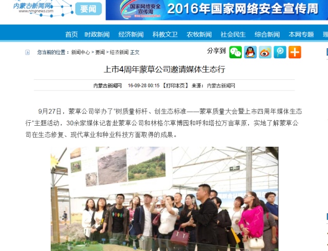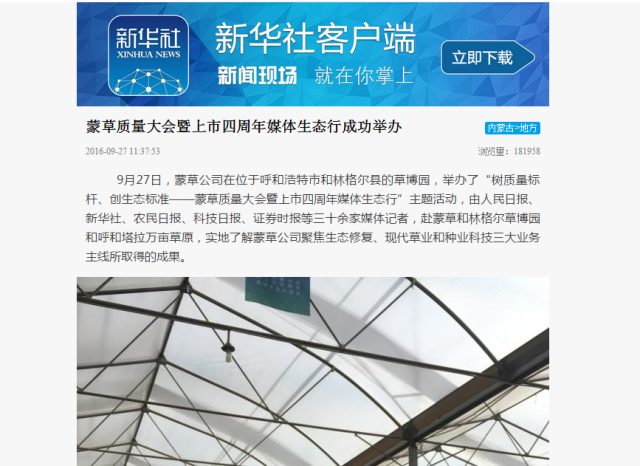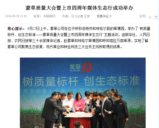 2016年9月27日,以“樹質(zhì)量標(biāo)桿、創(chuàng)生態(tài)標(biāo)準(zhǔn)”為主題的蒙草質(zhì)量大會(huì)暨上市四周年媒體生態(tài)行活動(dòng)在蒙草草原鄉(xiāng)土植物館拉開帷幕?;顒?dòng)期間,全國(guó)四十余家媒體記者共赴蒙草和林格爾草博園和呼和塔拉萬畝草原,實(shí)地了解蒙草公司聚焦生態(tài)修復(fù)、現(xiàn)代草業(yè)和種業(yè)科技三大業(yè)務(wù)主線所取得的成果。