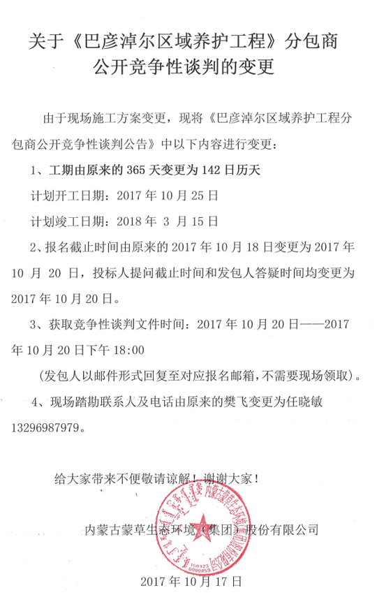 關于《巴彥淖爾區(qū)域養(yǎng)護工程》分包商 公開競爭性談判的變更