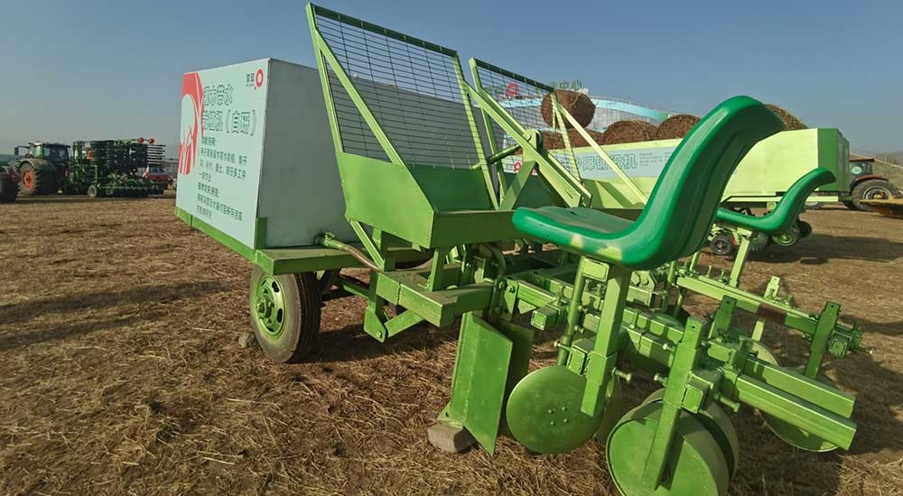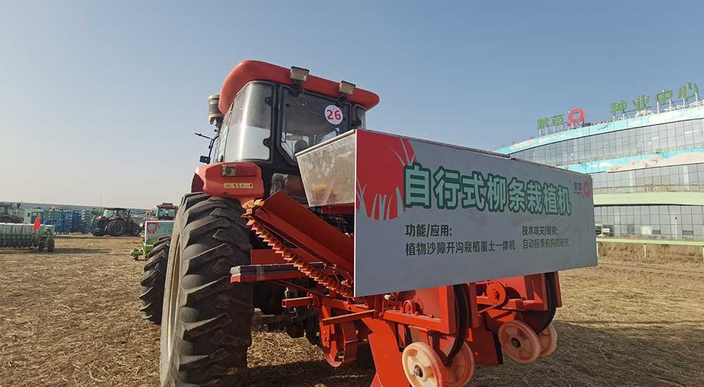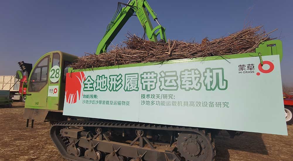 面積較大區(qū)域選用蒙草固沙機(jī)(自研)機(jī)械鋪設(shè)沙障。根據(jù)地形,利用蒙草固沙機(jī)一天可鋪設(shè)30—50畝高標(biāo)準(zhǔn)沙障