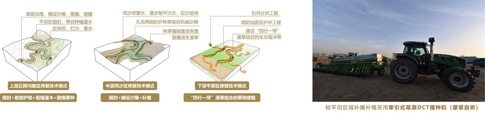 鎖邊治理模式(灌草結(jié)合防風(fēng)固沙技術(shù)、封沙育灌育草技術(shù))+機(jī)械沙障+溝川道路“切隔”治理